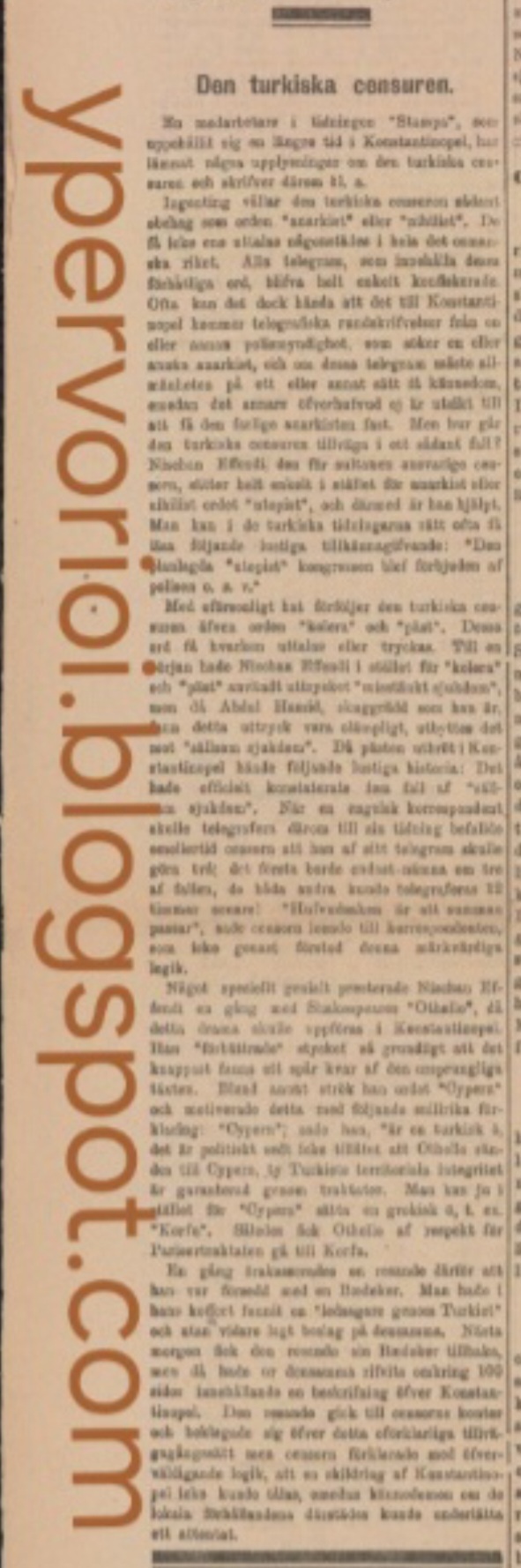 Στο φύλλο της 22ας Ιουλίου 1902, η "Göteborgs-Posten" δημοσιεύει ένα άρθρο για την τουρκική λογοκρισία στην Κωνσταντινούπολη επί Αμπντούλ Χαμίτ Β΄. Μέσα από χαρακτηριστικά παραδείγματα παρουσιάζεται η απαγόρευση λέξεων όπως «αναρχικός», «χολέρα» και «πανούκλα», καθώς και οι αλλοιώσεις ειδήσεων και λογοτεχνικών έργων. Σύμφωνα με το ρεπορτάζ που εντόπισε η ιστοσελίδα Υπερβόρειοι, ιδιαίτερη μνεία γίνεται στην περίπτωση του «Οθέλλου», όπου η αναφορά στην Κύπρο αφαιρέθηκε για πολιτικούς λόγους. Το κείμενο αναδεικνύει με ειρωνικό τρόπο τον αυθαίρετο και παράλογο χαρακτήρα της οθωμανικής λογοκρισίας.